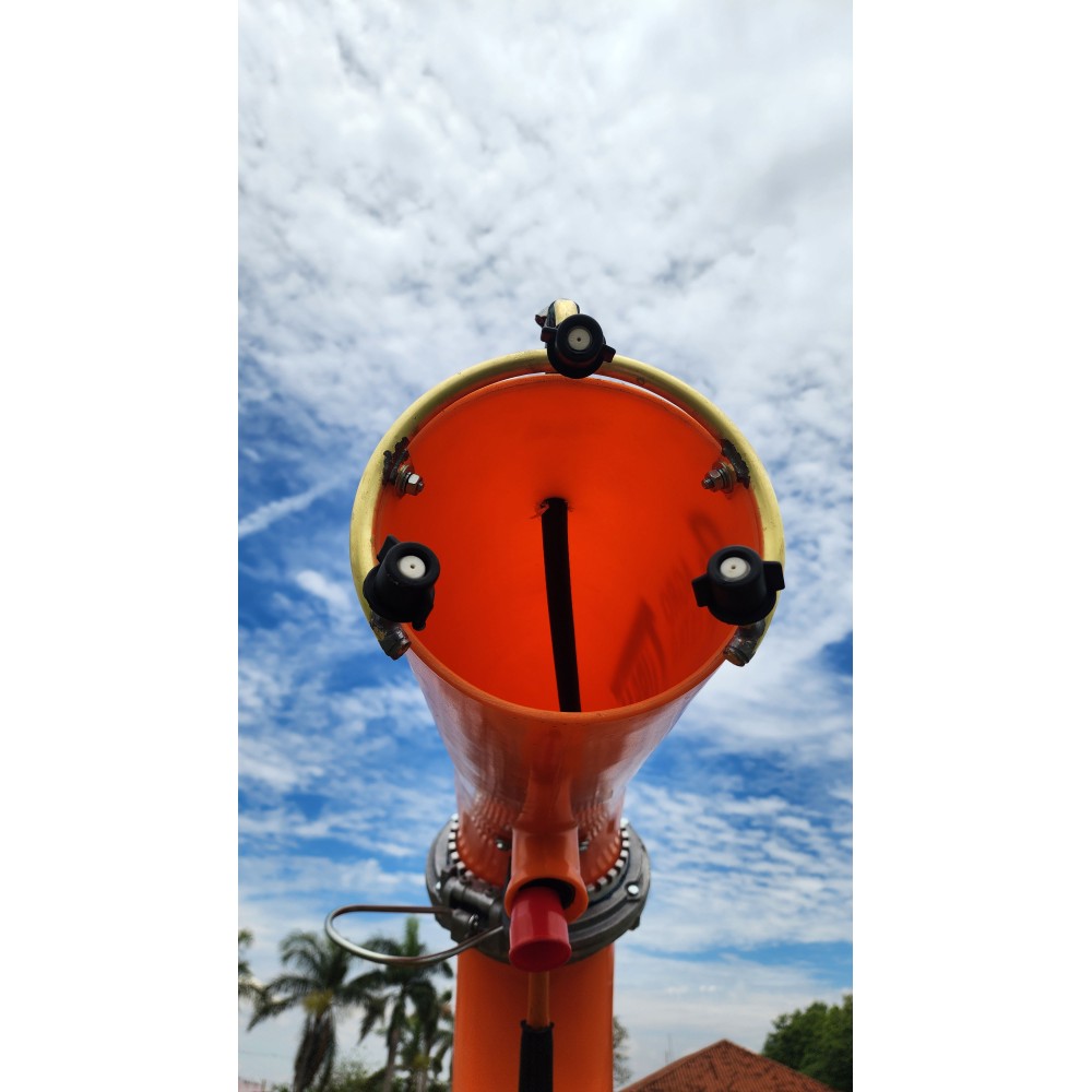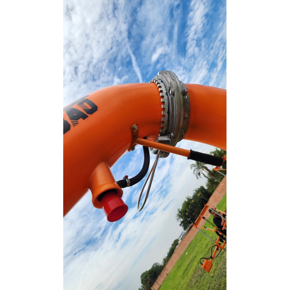 Conta ainda com filtro de sucção modelo Jacto, filtro de linha, bicos cerâmicos de alta durabilidade e serpentina em latão anticorrosivo, que aumenta a resistência e prolonga a vida útil do equipamento. O direcionamento do duto é manual, com engrenagem para posicionamento, facilitando o ajuste do jato conforme a necessidade da cultura.