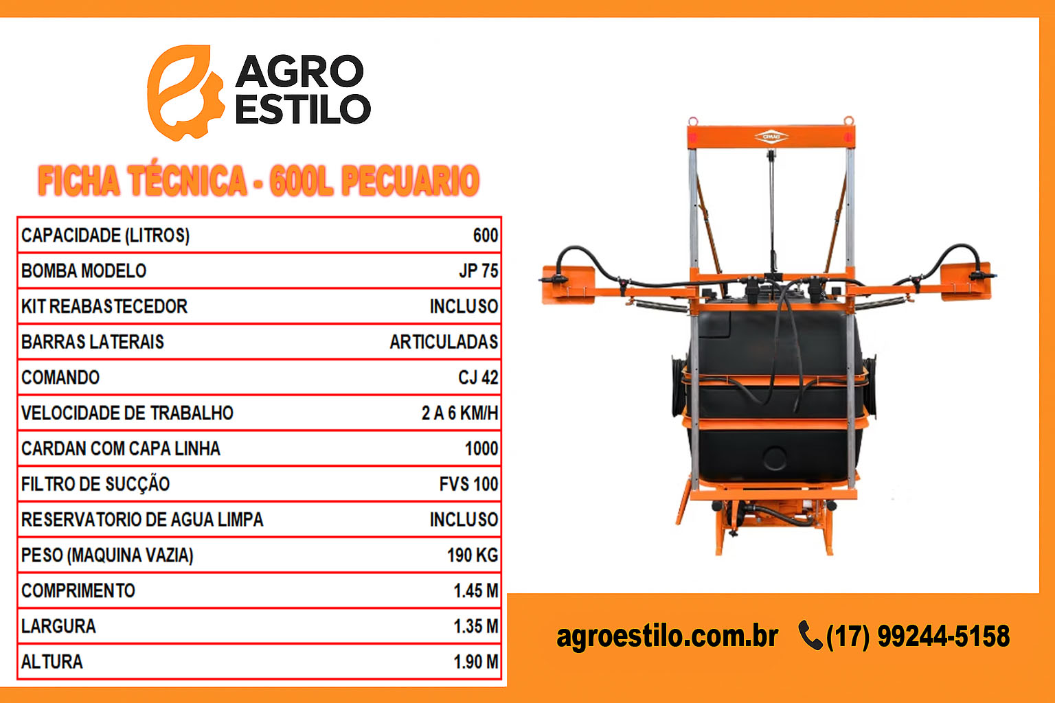 O Pulverizador 600 Litros AGRO ESTILO é ideal para aplicações agrícolas com alto desempenho e eficiência no campo. Equipado com tanque em polietileno de 600 litros, com reservatório de água limpa embutido, garante resistência e praticidade no manuseio. Seu chassi em aço carbono com pintura eletrostática proporciona maior durabilidade e proteção contra corrosão.