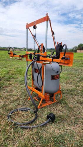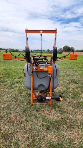 Equipado com bomba modelo JP 40 e comando CJ 42, o pulverizador garante uma pulverização constante e controlada, facilitando o manejo e reduzindo o desperdício. Seu barramento de 1,50 metro com 4 bicos proporciona uma faixa de aplicação de 10 a 12 metros, assegurando cobertura uniforme em diferentes tipos de culturas.